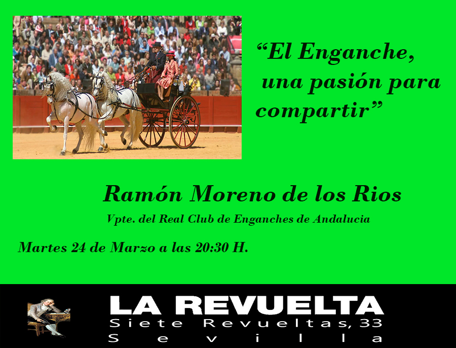 El próximo Martes 24 de Marzo, La Revuelta acogerá a uno de los mas apasionados defensores de esta modalidad Hípica tan nuestra. Ramón Moreno de los Rios, disertará sobre el desconocido mundo del Enganche a las puertas de nuestra Feria de Abril.